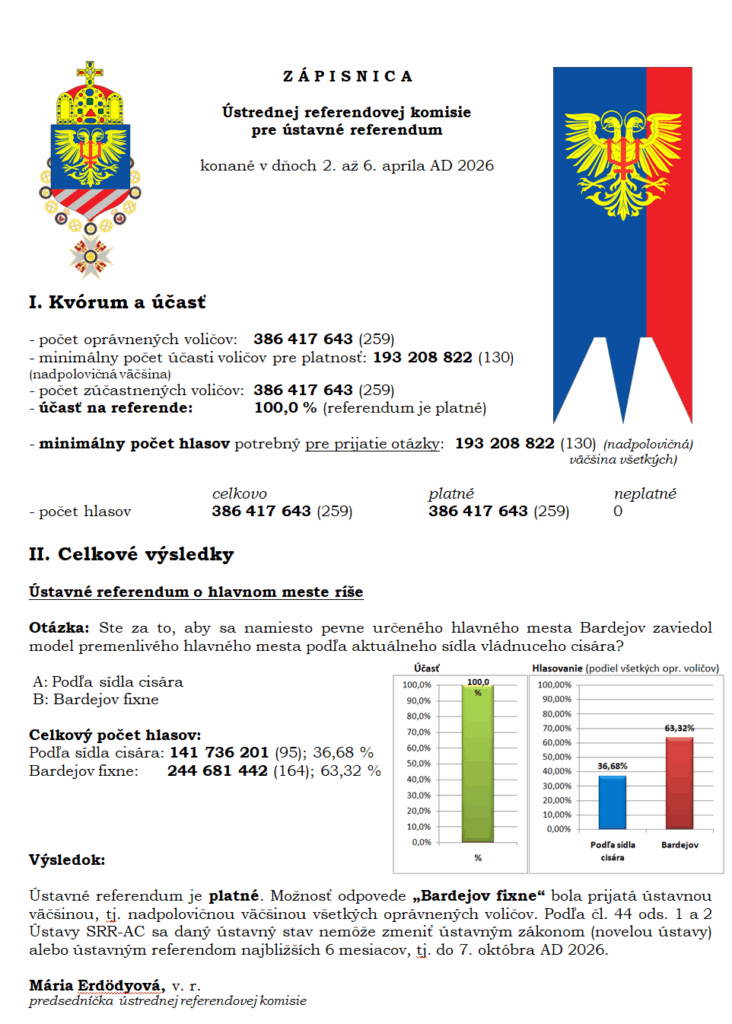 Ústredná referendová komisia oznamuje, že ústavné referendum konané elektronickou formou v termíne od 2. apríla 2026 o 10:00 do 6. apríla 2026 o 24:00 prebehlo riadne a bolo vyhodnotené s týmito výsledkami: